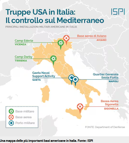 Sigonella, Sicilia. Conosciuta come «la portaerei del Mediterraneo», la base di Sigonella, situata vicino a Catania, rappresenta uno degli avamposti più strategici degli Stati Uniti nel Mediterraneo. La sua posizione permette un rapido accesso a obiettivi in Nord Africa, Medio Oriente e Africa subsahariana. La base aeronavale ospita droni MQ-9 Reaper — tra cui quelli utilizzati dagli USA il 30 gennaio 2020 per eliminare il generale iraniano Qasem Soleimani — e velivoli di sorveglianza come gli EP-3. Inoltre, svolge un ruolo centrale per il comando Africom, istituito nel 2007 per coordinare le operazioni militari statunitensi su tutto il continente africano.
