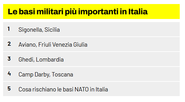 Cosa rischio le basi NATO in Italia? Ma quanto è plausibile che l’Iran possa attaccare le basi NATO in Italia? Gli esperti concordano nel ritenere molto improbabile che Teheran decida di espandere il conflitto oltre.