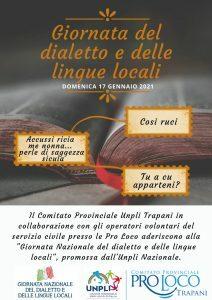 Anche il Comitato provinciale Unpli Trapani ha aderito alla “Giornata nazionale del dialetto e delle lingue locali” promossa dall’Unpli nazionale e che si tiene, da ben nove anni, il 17 gennaio. Per questa occasione, la presidente provinciale Unpli Trapani e della Pro loco Vitese Maria Scavuzzo, ha voluto sensibilizzare gli operatori volontari della provincia, invitandoli a proporre delle iniziative volte a ricercare e ritrovare una sintonia con le proprie tradizioni culturali e dialettali.