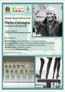 Nel corso dell’incontro sarà proiettato il video Pietro Consagra, la sua voce, a cura di Pinamaria Ripa. La tavola rotonda si terrà martedì 4 agosto 2020, alle ore 21.00, nel chiostro del Collegio dei Gesuiti di Mazara del Vallo. Stante il numero limitato di posti resi disponibili dall’osservanza delle norme di prevenzione sanitaria, si consiglia la massima puntualità per assicurarsi l’accesso al chiostro.