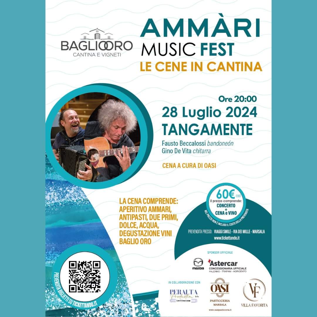 Ogni serata inizierà con una cena a base di prodotti tipici locali, accompagnata dai pregiati vini Baglio Oro, per un’esperienza sensoriale completa che coinvolgerà tutti i sensi. Il 28 luglio si comincia con TANGAMENTE con Fausto Beccalossi (bandoneón) e Gino De Vita (chitarra): un omaggio al tango argentino con un repertorio che spazia dai classici di Astor Piazzolla e Carlos Gardel a composizioni originali.