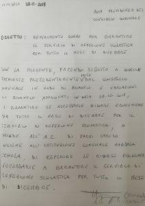 Copia dell’emendamento si allega al presente comunicato. La mozione è sottoscritta all’unanimità dei Consiglieri presenti aula ed è frutto di quanto emerso in fase dibattimentale. VOTAZIONE PUNTO 16 – VARIAZIONI DI BILANCIO Approvato con 15 voti favorevoli e 1 contrario VOTAZIONE IMMEDIATA ESECUTIVITA’ DELIBERA PUNTO 16 Approvata con 15 voti favorevoli e 1 contrario VOTAZIONE MOZIONE PER AUMENTO FONDI PER GARANTIRE REFEZIONE SCOLASTICA X IL MESE DI DICEMBRE La consigliera Ginetta Ingrassia lamenta che molti ragazzi non vanno a scuola per il non perfetto funzionamento del servizio scuolabus.