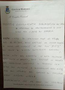 Votato all’unanimità un apposito atto d’indirizzo, precedentemente emendato. La consigliera Rosanna Genna aderisce al Partito “Fratelli d’Italia” La seduta del Consiglio comunale di Marsala di ieri pomeriggio ha visto l’approvazione, all’unanimità, di un atto d’indirizzo con il quale l’Assise di Palazzo VII Aprile e l’Amministrazione si sono trovati pienamente d’accordo ad assegnare all’Avis di Marsala i locali al piano terra dell’ex sede dell’Ufficio Tecnico. Tutti hanno evidenziato l’azione meritoria dell’Avis che merita di avere assegnati i locali per quello che riesce a fare.