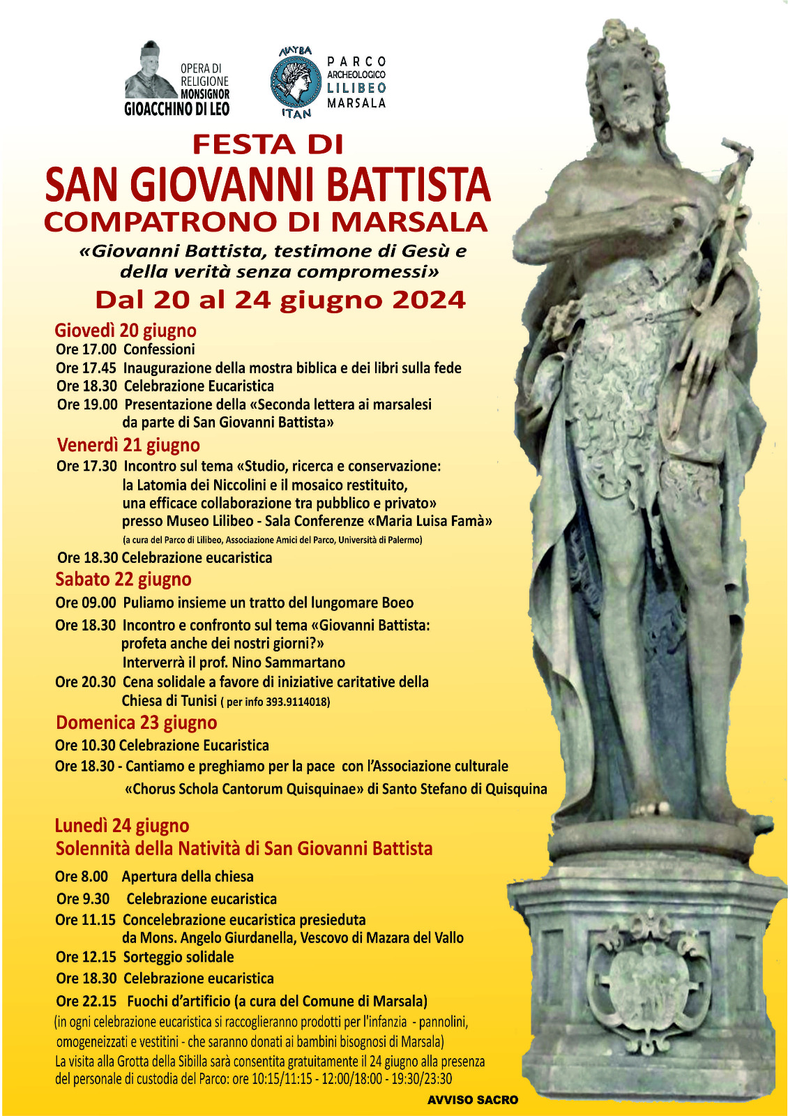 I tradizionali festeggiamenti in onore di San Giovanni Battista - che ricorrono oggi a Marsala - prevedono, anche quest'anno, lo spettacolo pirotecnico all'interno del Parco Lilibeo. Il notevole afflusso di persone nell'area circostante la Chiesa dedicata al Santo, comporta pertanto anche misure di sicurezza legate alla viabilità veicolare e pedonale. Al riguardo, il provvedimento della Polizia Municipale dispone per l'odierna giornata: