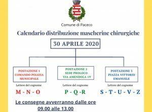Inizia questa mattina, per proseguire domani (giovedì 30 Aprile) in base all'ordine alfabetico, la consegna delle mascherine di protezione alle famiglie di Paceco, attraverso tre punti di distribuzione allestiti in altrettanti locali comunali, suddivisi per iniziali di cognomi.