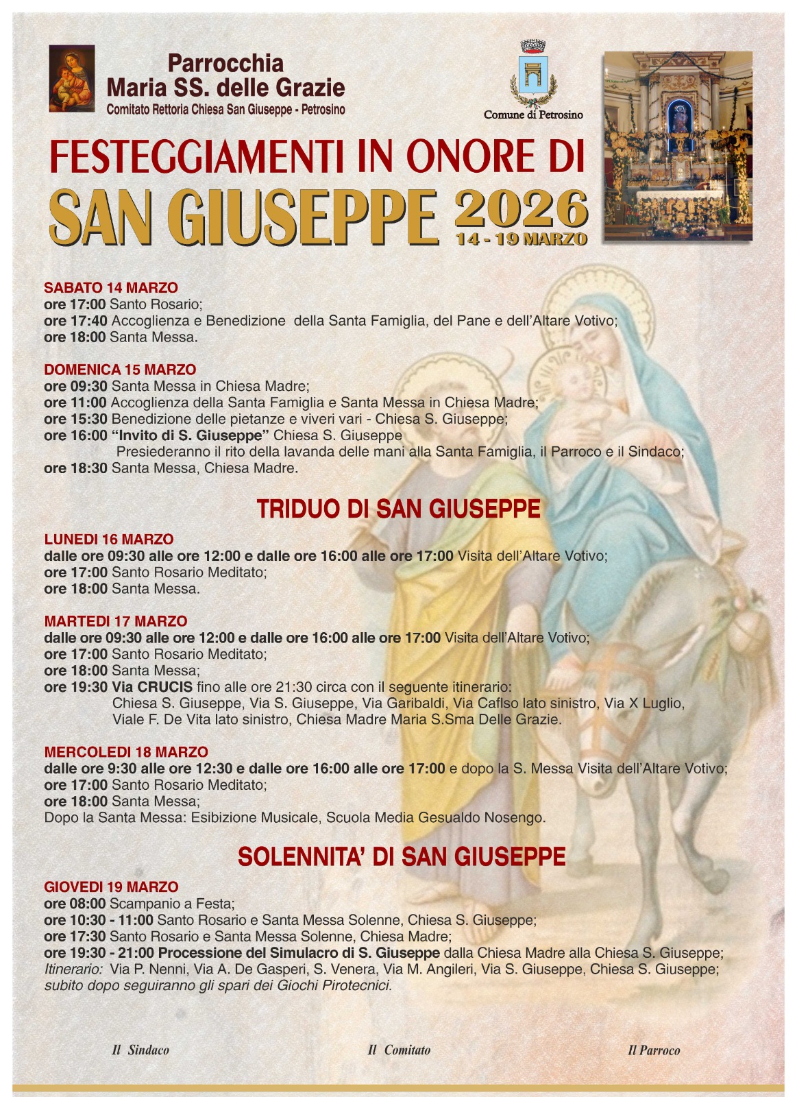 Il Sindaco Giacomo Anastasi dichiara:“San Giuseppe rappresenta per Petrosino un momento di grande devozione ma anche un’importante espressione della nostra identità culturale. Tradizioni come l’‘Ammitu’ raccontano la storia della nostra comunità e il valore della condivisione. Invito cittadini e visitatori a partecipare numerosi a questi giorni di festa che uniscono fede, tradizione e senso di appartenenza.”L’Amministrazione Comunale ringrazia Don Carmelo Caccamo, il Comitato Rettoria Chiesa San Giuseppe e tutti coloro che collaborano alla realizzazione dei festeggiamenti.