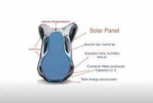 Altro core business dell’azienda sarà lo “Zaino HiTech” (vedi foto n.2) che verrà realizzato con un particolare materiale a base di silicio capace di produrre energia dal sole, la stessa sarà accumulata e servirà per il funzionamento del sistema, che produrrà 5 litri d’acqua al giorno ricavata dall’umidità presente in atmosfera.