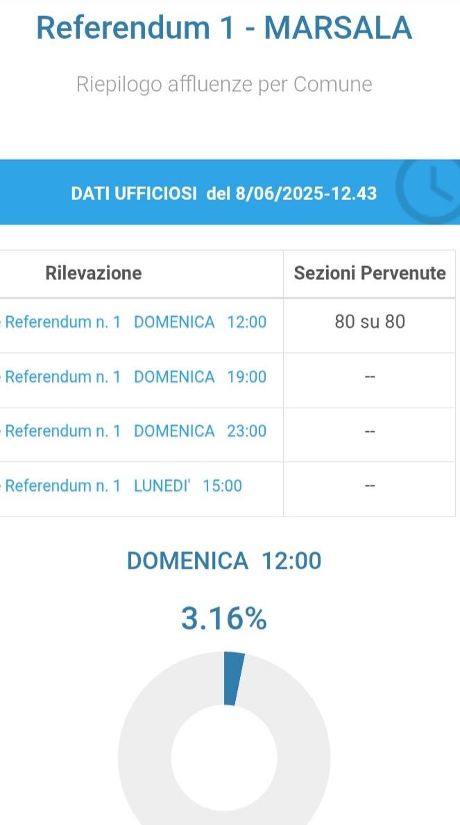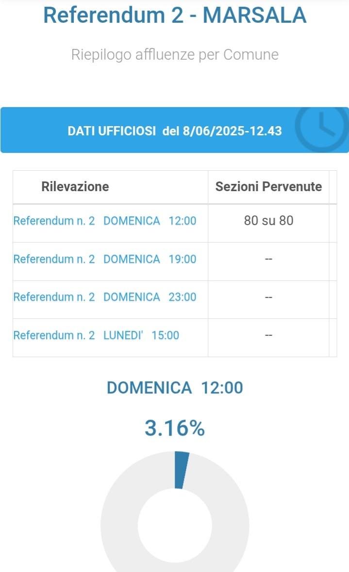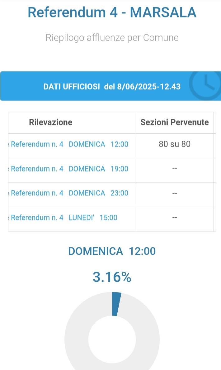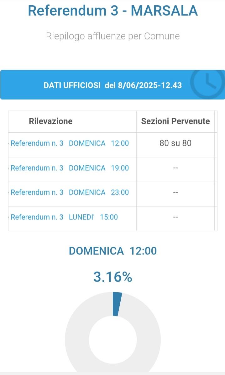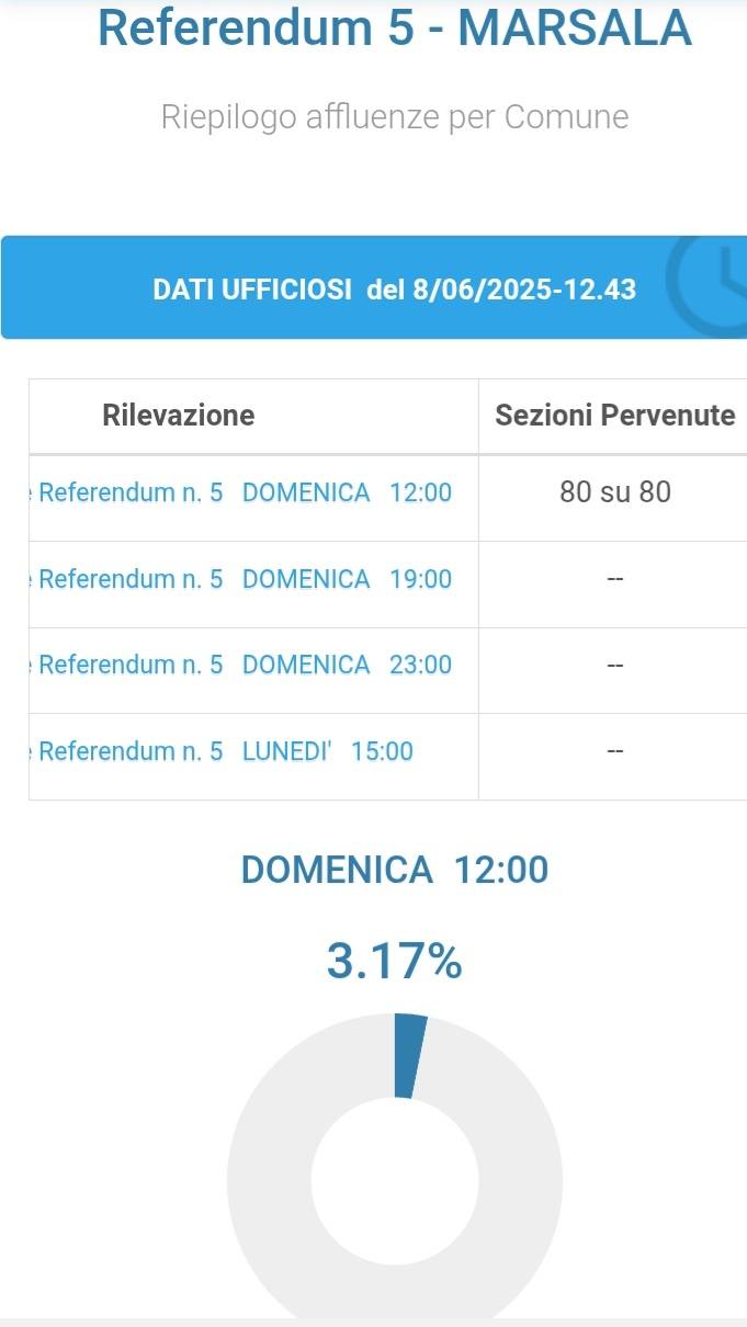 Questo riporta i dati ufficiali riguardanti il Referendum 5 a Marsala, aggiornati al 8 giugno 2025 alle 12:43. Alla data indicata, alle ore 12:00, tutte le sezioni (80 su 80) erano state conteggiate, con una partecipazione del 3,17%. Se hai bisogno di ulteriori dettagli o analisi, chiedimi pure!