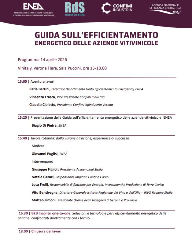La presentazione tecnica della guida sarà affidata a Biagio Di Pietra, ricercatore ENEA.A seguire, una tavola rotonda moderata da Giovanni Puglisi (ENEA) metterà a confronto le esperienze di successo del settore. Tra i relatori figurano Giuseppe Figlioli (Assoenologi Sicilia), Natale Geraci (Cantine Corvo), Luca Frulli (Terre Cevico), Vito Bentivegna (IRVO Sicilia) e Matteo Limoni (Ordine degli Ingegneri di Verona).